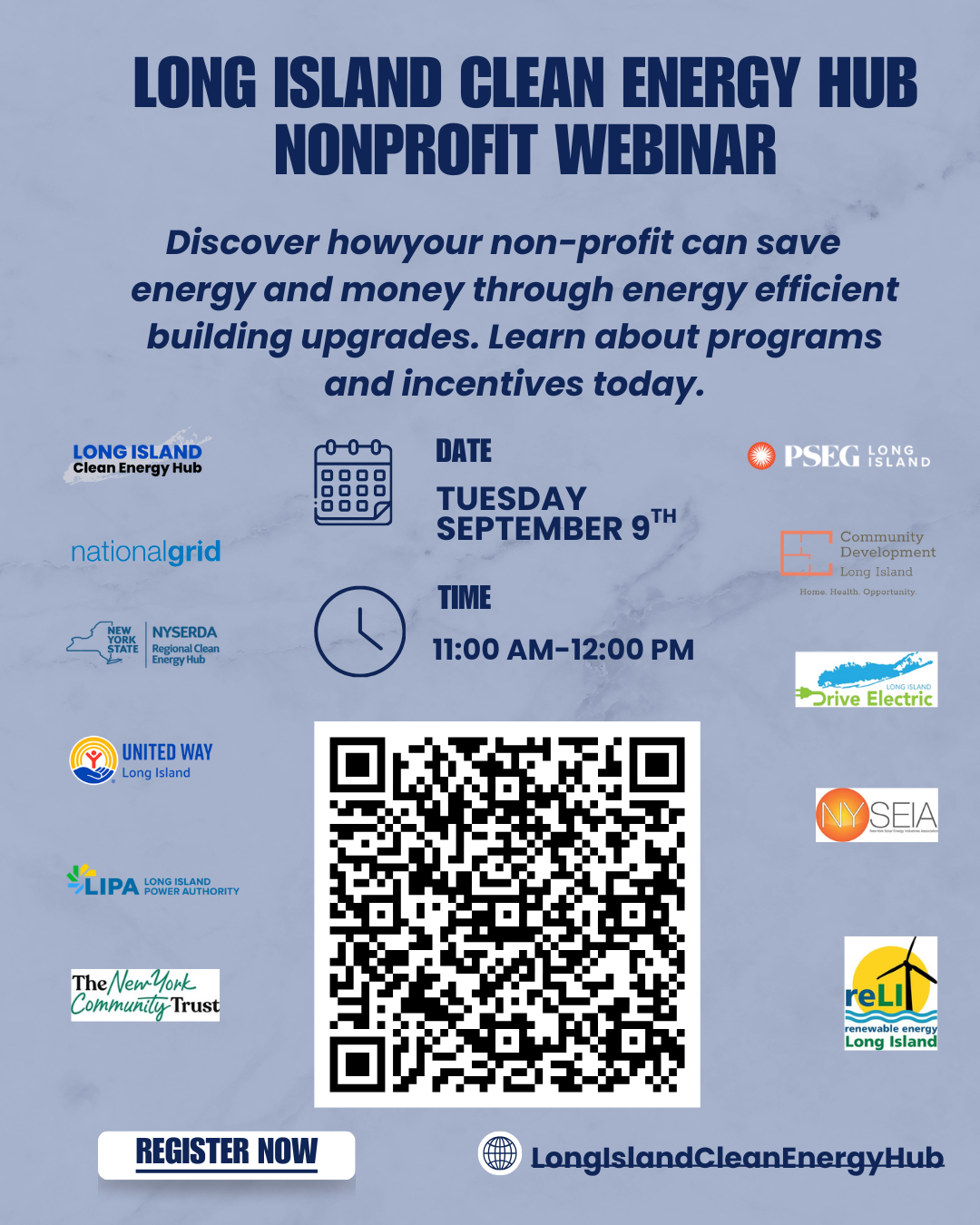 We’d love for you to join us on Tuesday, September 9th from 11:00AM–12:00PM for a special Long Island Clean Energy Hub Nonprofit Webinar! This friendly, one-hour session will show how your nonprofit can save money and reduce energy costs through energy conservation, building upgrades, electrifying your fleets and equipment like trucks and forklifts, going solar, and even tapping into grant opportunities. It’s a great chance to learn about programs and incentives designed just for organizations like yours. Please feel free to share this invite with other nonprofits in your network who could also benefit—we want as many groups as possible to take advantage of these resources. Register here